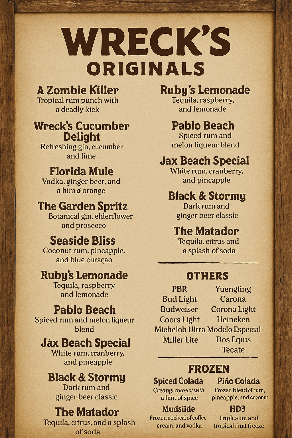 MENUEVENTSGALARYCONTACTWhat's Next?Haze BrothersLive at the WreckOct 5, 2025 5:00pm – 8:00pmThe Wreck Tiki Lounge The Wreck Tiki Lounge401 1st St N, Jacksonville Beach, FL 32250 The Wreck Tiki Lounge401 1st St N, Jacksonville Beach, FL 32250Bar and LoungeJoin us at The Wreck Tiki Lounge for crafted cocktails, live DJs, and unforgettable island vibes every day and night!About Us